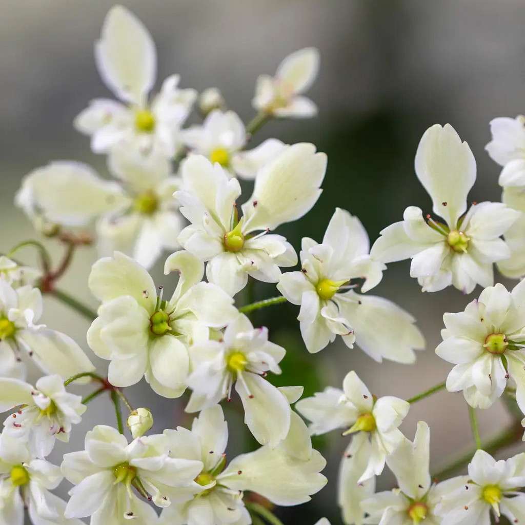 W okresie kwitnienia - X-XI - pojawiają się liczne, cienkie pędy zakończone chmurą białokremowych kwiatów.