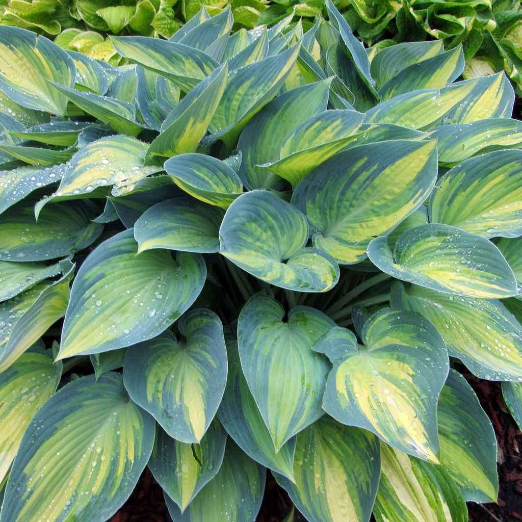 To odmiana o żółtozielonych liściach z nieregularnym, niebieskim brzegiem. Kępa dorasta zwykle do około 45 cm wysokości i z czasem osiąga mniej więcej 50 cm szerokości.