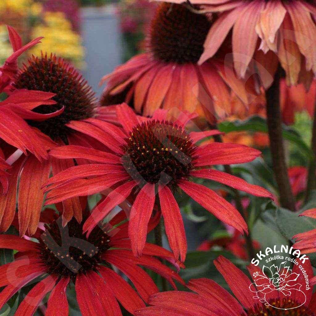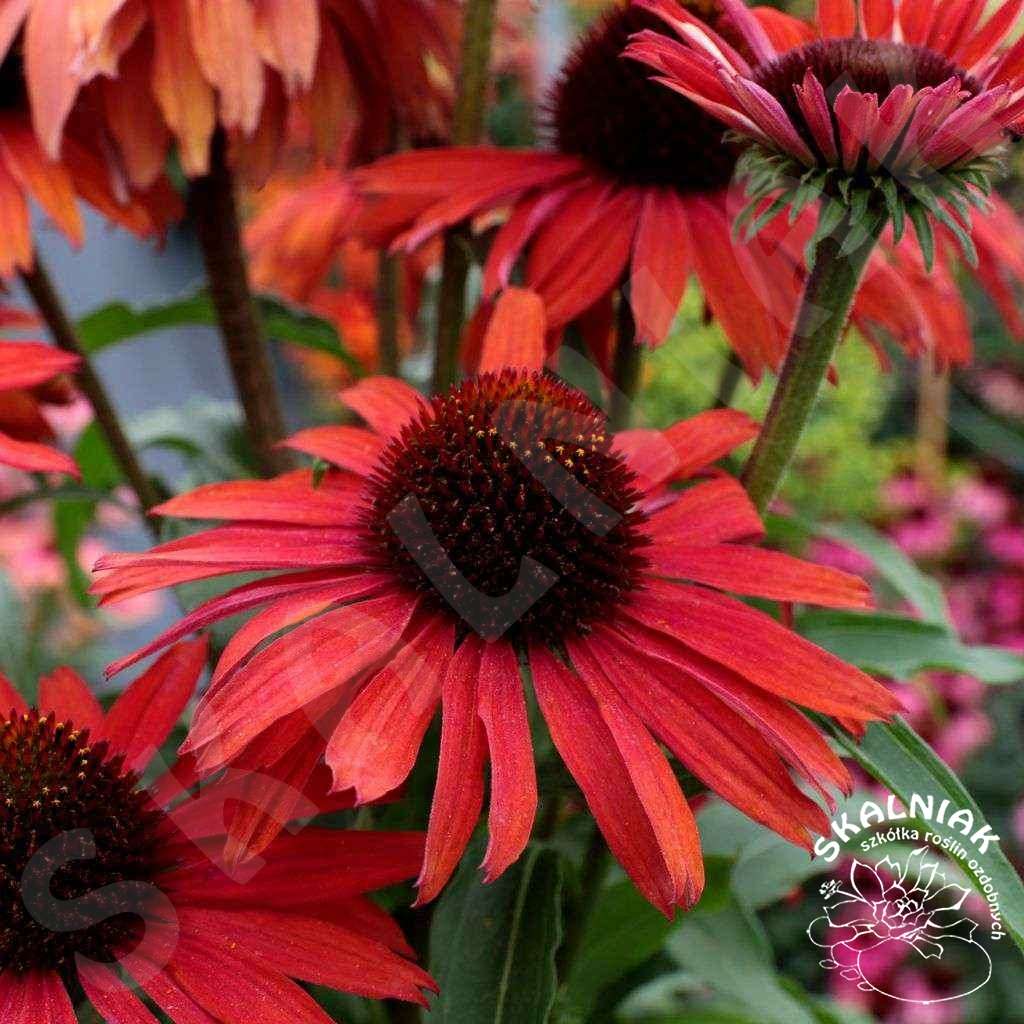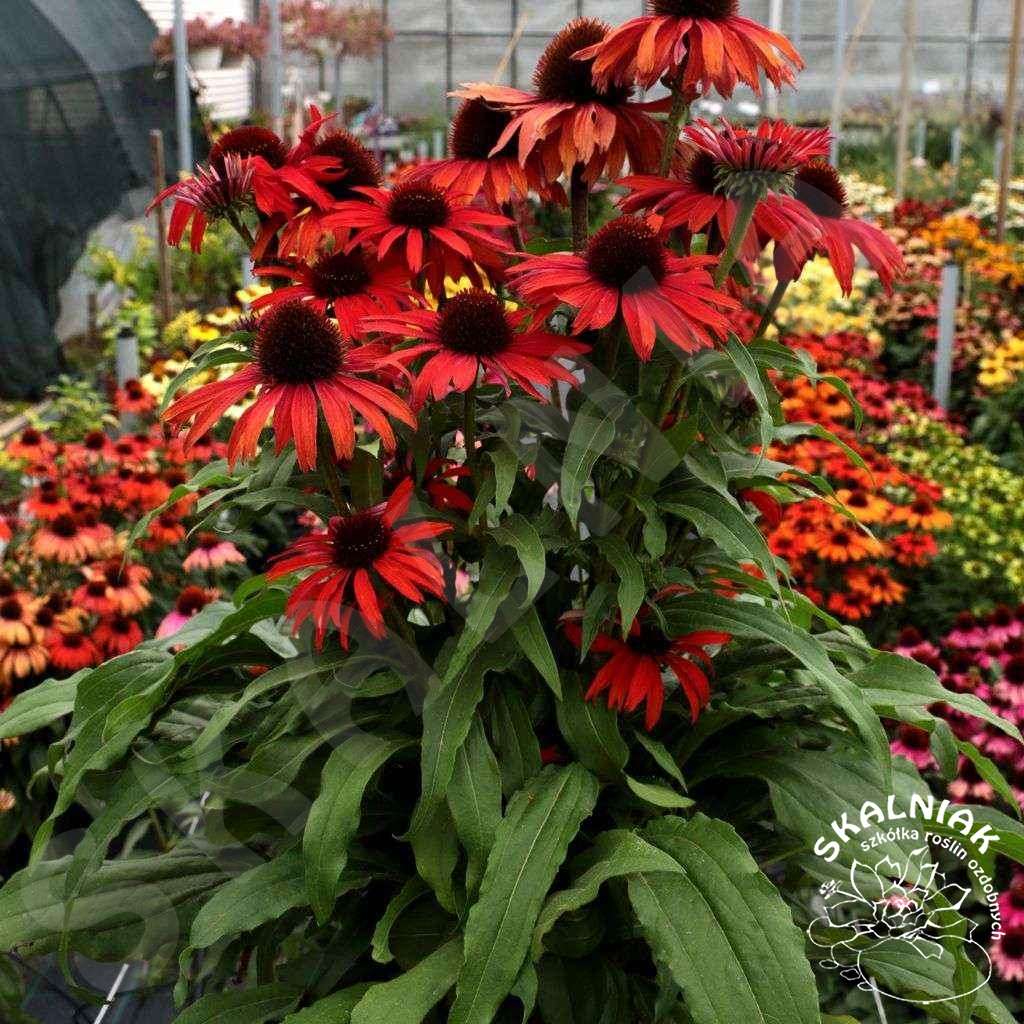 Jeżówka purpurowa 'Fountain Red' - to kępiasta bylina, pełnego słońca. Jeżówka 'Fountain Red' to odmiana o czerwonych płatkach i brązowym środku. Doskonała do sadzenia z przodu rabaty. Kwiatostan jest osadzony na pędzie dorastającym do 45cm wysokości. Gdy nie kwitnie kępa osiąga 20 cm szerokości i 40 cm wysokości. Kwitnie od lipca do września. Liście są zielone, szorstkie, pokryte krótkimi włoskami. Jest to bylina łatwa w pielęgnacji, dobrze zimująca w naszych warunkach klimatycznych. Do dobrego wzrostu potrzebuje gleby próchnicznej, lekko wilgotnej.