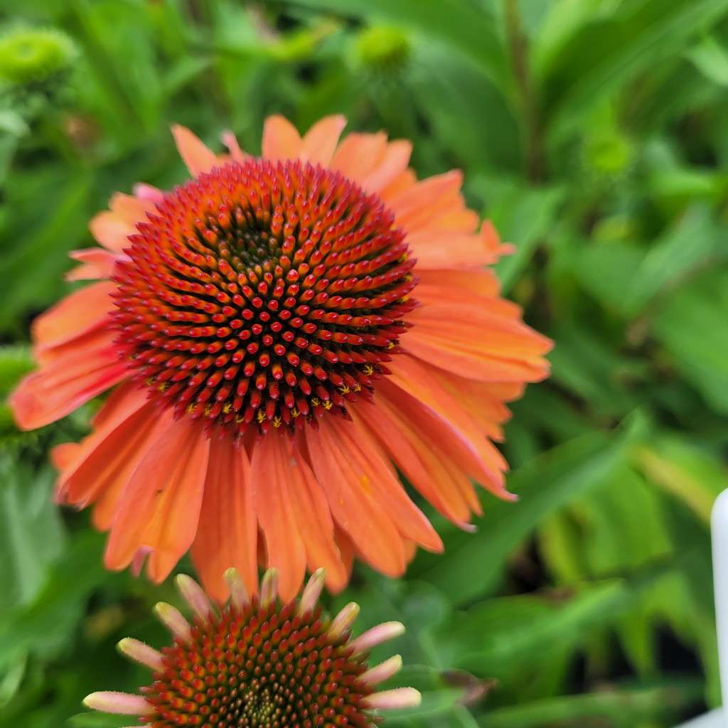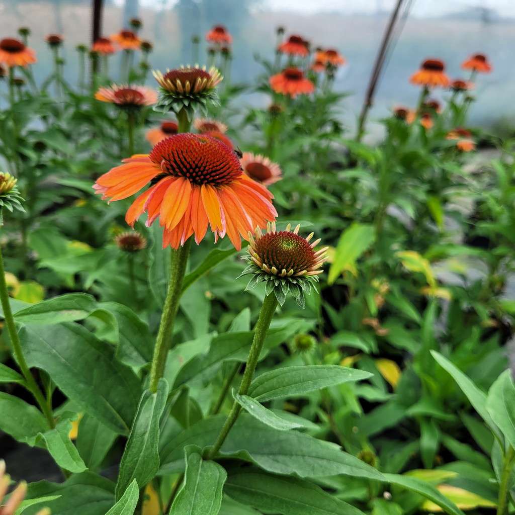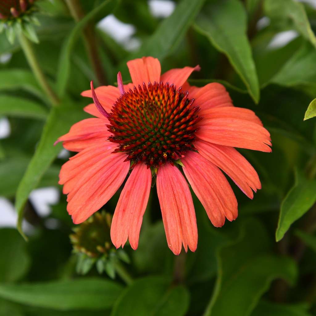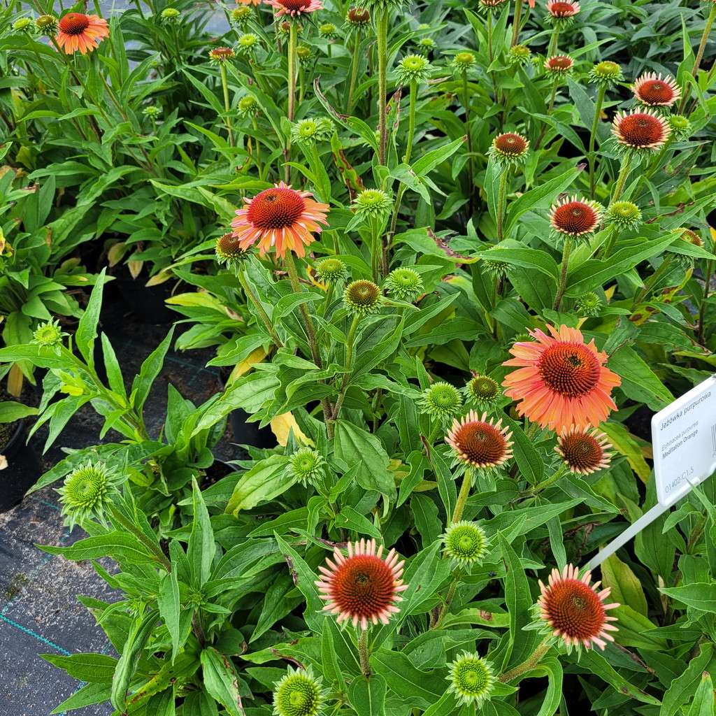 Echinacea purpurea 'Meditation Orange' – ma duży, różowy kwiatostan osadzony jest na pędzie dorastającym do 45 cm wysokości, dlatego sprawdzi się do obsadzeń przedniej części rabaty. Kwitnie od lipca do września. Liście są zielone, szorstkie, pokryte krótkimi włoskami.