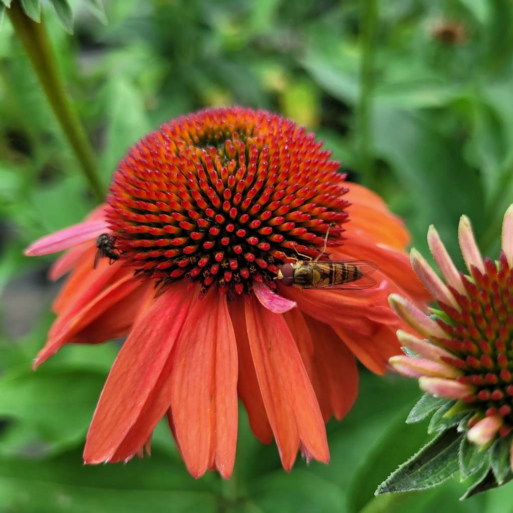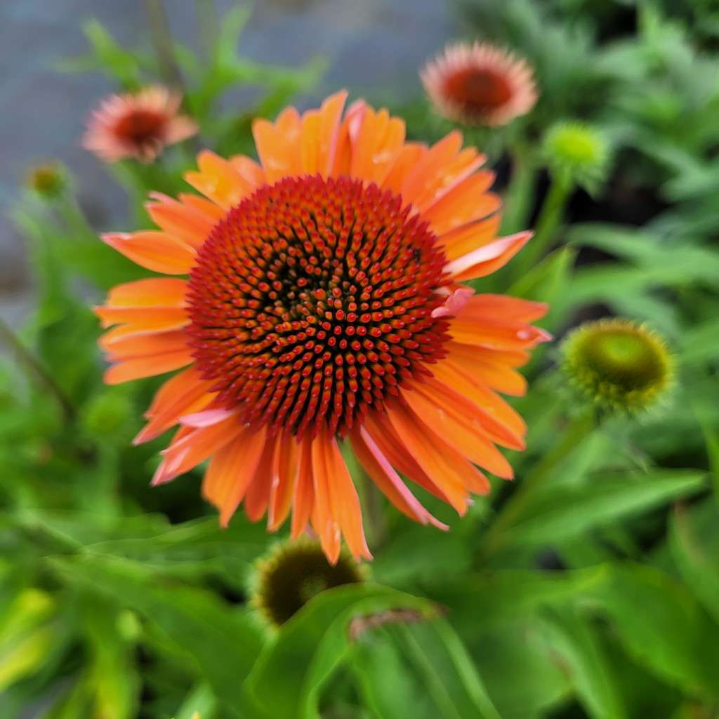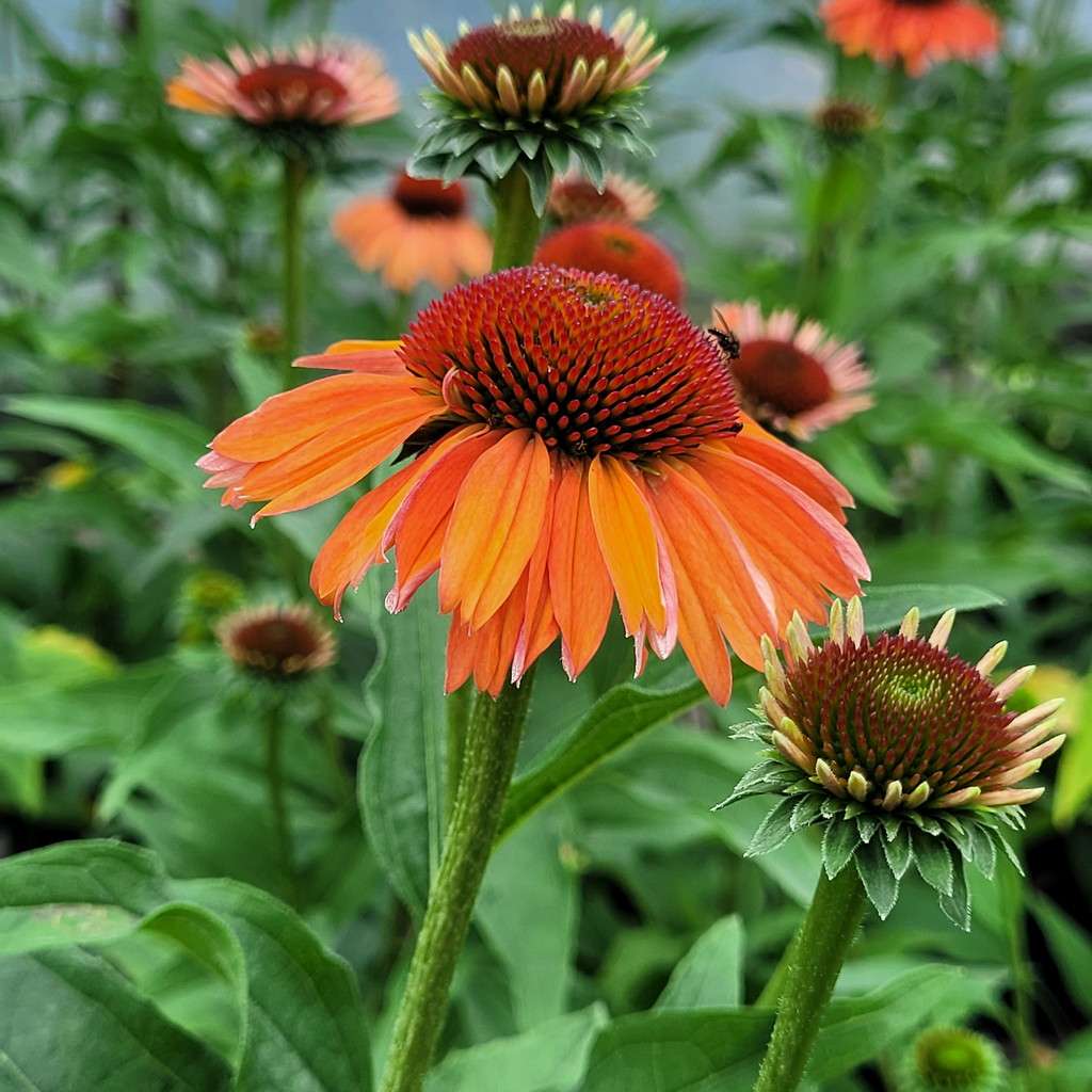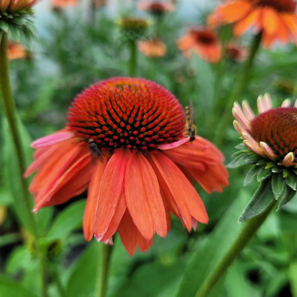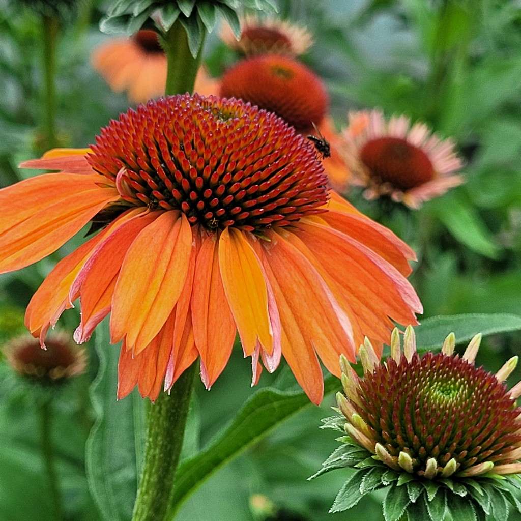 Echinacea purpurea 'Meditation Orange' – ma duży, różowy kwiatostan osadzony jest na pędzie dorastającym do 45 cm wysokości, dlatego sprawdzi się do obsadzeń przedniej części rabaty. Kwitnie od lipca do września. Liście są zielone, szorstkie, pokryte krótkimi włoskami.