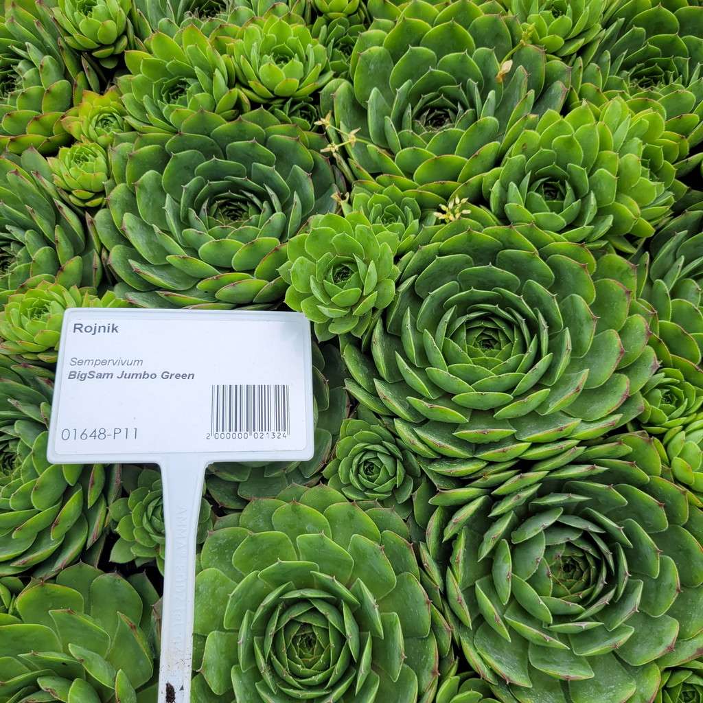 Rojnik 'BigSam Jumbo Green' - jest to wieloletnia bylina gruboszowata. Liście układają się w rozetę. Odmiany BigSam osiągają duże szerokości rozet - nawet do 15 cm, przy wysokości ok 5 cm. Wiosną i jesienią możemy zaobserwować dużą zmienność w kolorze liści. Na zmianę koloru rozety liściowej wpływa ilość światła oraz ilość składników pokarmowych w podłożu.