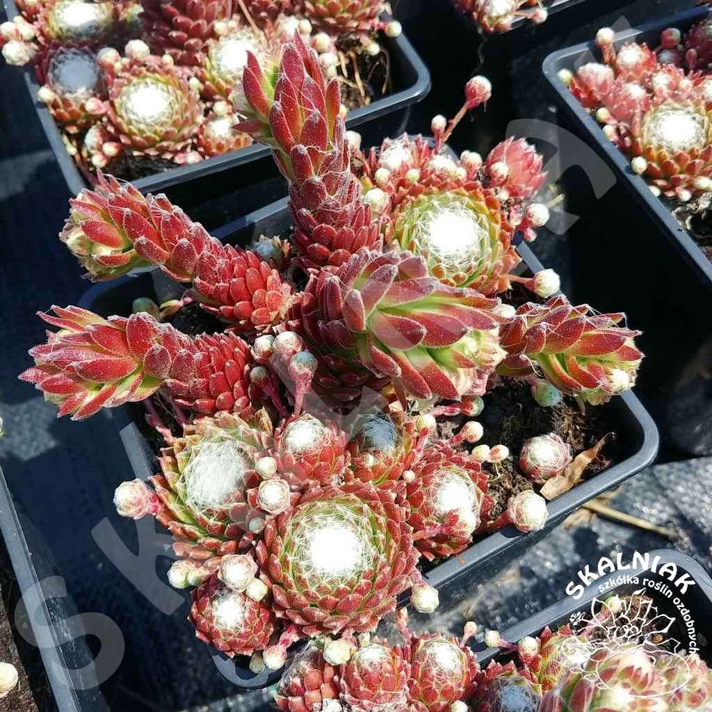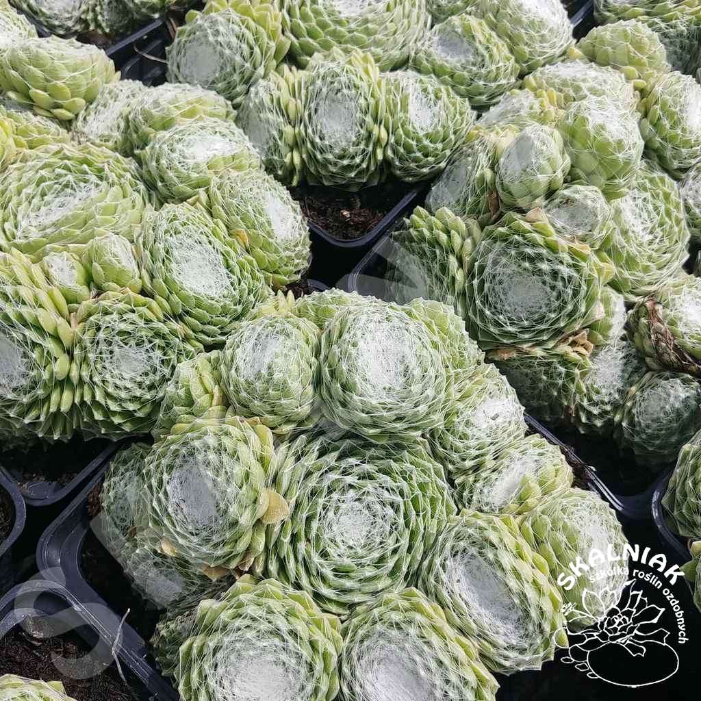 Rojnik pajęczynowaty 'Sirius' - to wieloletnia bylin gruboszowata, tworząca charakterystyczne rozety liściowe. Prezentowana odmiana ma rozety różnej wielkości, a liście są zielone (czasem czerwono i niebiesko podbarwione). Odmiana ta ma charakterystyczną włoski na rozecie przypominające pajęczynkę - stąd jego nazwa. Kwitnie na różowo od lipca do sierpnia. W trakcie kwitnienia kwiatostan wyrasta na wysokość do 20 cm. Rojniki są bardzo łatwe w uprawie - najlepiej udają się na miejscach słonecznych, piaszczystych, suchych. Rojniki wyjątkowo dobrze znoszą mróz. Sempervivum jest "obowiązkową" rośliną na skalniaki, skarpy, do ogrodów górskich, słonecznych rabat. Bylina ta fantastycznie wygląda wśród kamieni i żwirów. Ostatnio coraz częściej widzimy je w obsadzeniach płaskich donic tarasowych, czy jako wypełniacz między niskimi krzewami. Nadają się do tworzenia obwódek i wykończenia rabat. Mogą być stosowane do wiązania niewielkich skarp i pochyłości. Coraz częściej występują na obsadzeniach zielonych dachów.