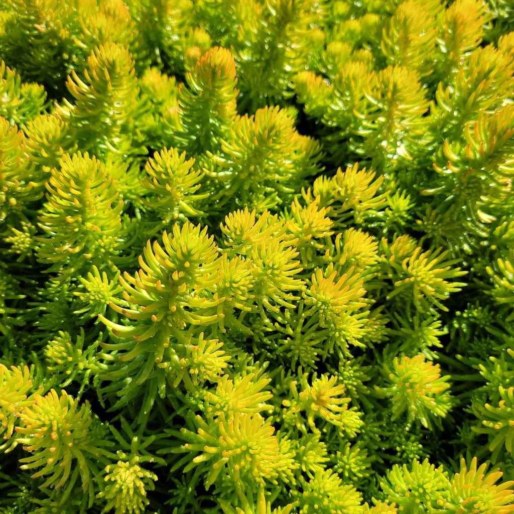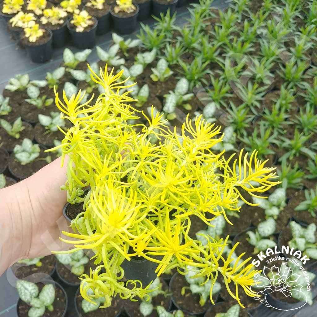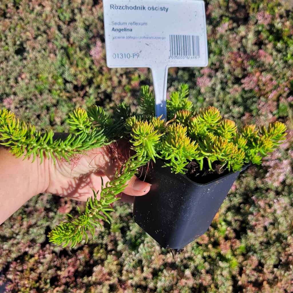 Rozchodnik ościsty 'Angelina' (Sedum reflexum - Sedum rupestre) - to wieloletnia bylina gruboszowata, zadarniająca, dorastająca do wysokości 20 cm. Rozchodnik ościsty 'Angelina' charakteryzuje się mięsistymi, cytrynowymi liśćmi w formie drobnych igiełek (im bardziej słoneczne jest stanowisko tym są one bardziej żółte). Rozchodnik ościsty kwitnie od czerwca do września dużymi żółtymi baldachogronami.