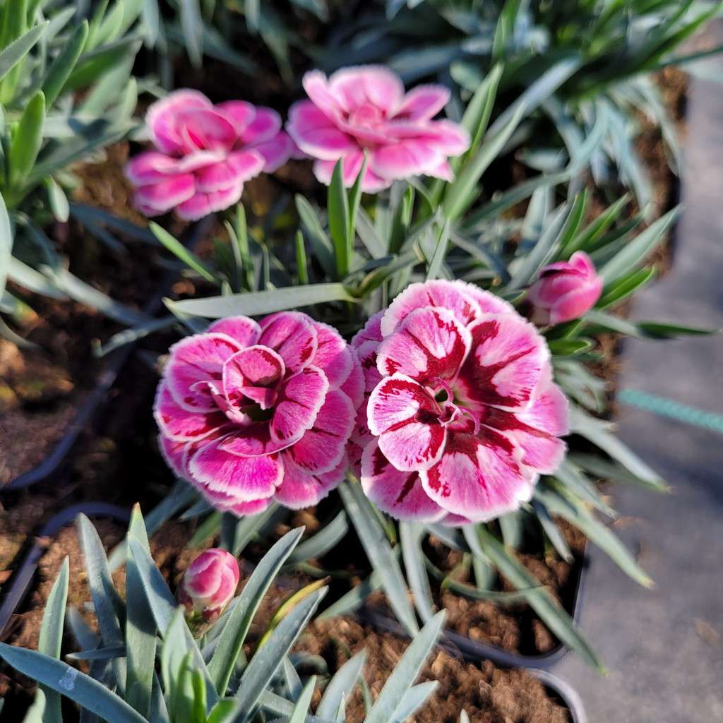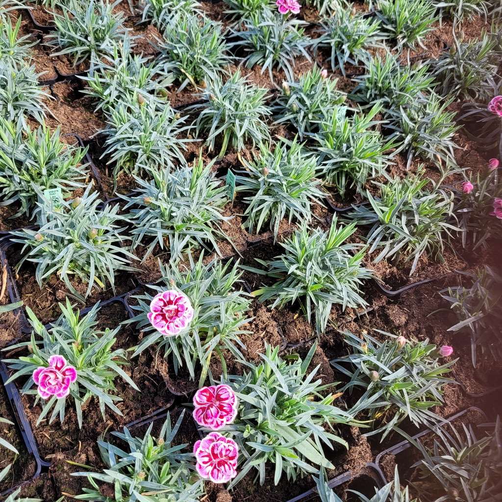 Goździk 'Strawberry Ice' - jest jedną z najtrwalszych i najładniejszych bylin dywanowych, która rośnie w pełnym słońcu. Goździk ten tworzy zwarte, niskie kępy szarozielonych liści. Kwitnie późną wiosną / wczesnym latem (V-VI) - licznymi kwiatami, półpełnymi jasnoróżowymi z ciemnoóżówymi wypełnieniem. W momencie kwitnienia osiąga 25 cm wysokości i około 20 cm szerokości.