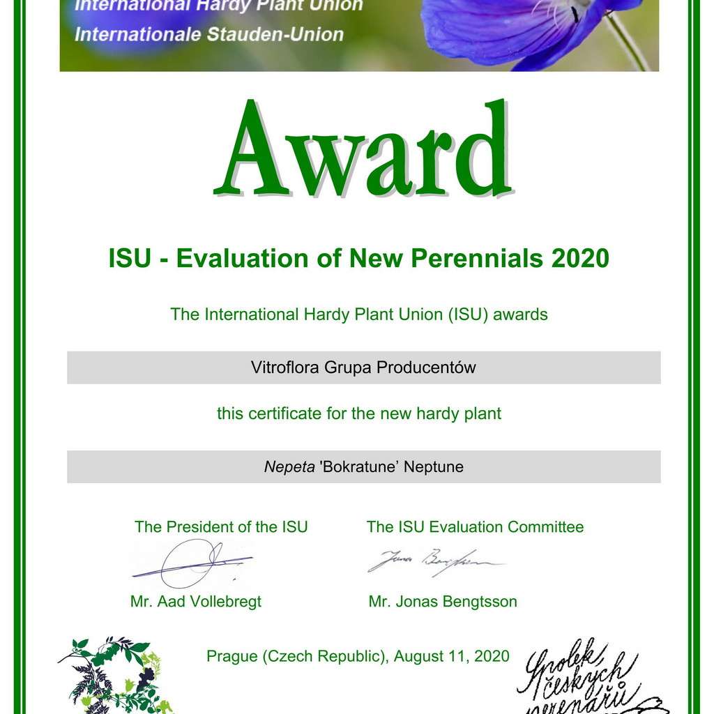 Kocimiętka 'Neptune' – to piękna bylina kwitnąca bardzo długo, bo aż od VI do IX. Jej kwiaty są koloru niebieskiego, większe niż u tradycyjnych kocimiętek Fassena. Liście są zielone, szorstkie w dotyku. Kocimiętka 'Neptune' dorastająca w trakcie kwitnienia do 45 cm i osiągająca szerokość 30 cm. Kocimiętka 'Neptune' ma pędy lekko wyprostowane. Po przekwitnięciu warto ją przyciąć, dzięki czemu zagęści się i powtórzy kwitnienie. Kocimiętka to nie tylko cenna roślina, która rośnie w pełnym słońcu ale jest również ziołem. Wytwarza ona olejki eteryczne, które mają przyjemny miętowy zapach. Kocimiętka jest bardzo łatwa w uprawie, dobrze znosi zimę naszego klimatu. Polecamy ją do każdego typu ogrodu, a także do nasadzeń doniczkowych np. na balkonach. Kocimiętka sprawdza się doskonale na mocno nasłonecznionych rabatach bylinowych oraz skalniakach, a także do podsadzenia drzew i krzewów, np. jako wypełnienie między nimi. Bylina ta sprawdza się też jako roślina obwódkowa i na obrzeża oczek wodnych. Byliny tej nie powinno zabraknąć w ogrodach w stylu naturalistycznym, angielskim czy wiejskim. Kocimiętka ładnie skomponuje się z takimi bylinami jak: macierzanki, goździki, żurawki, czy floksy szydlaste.