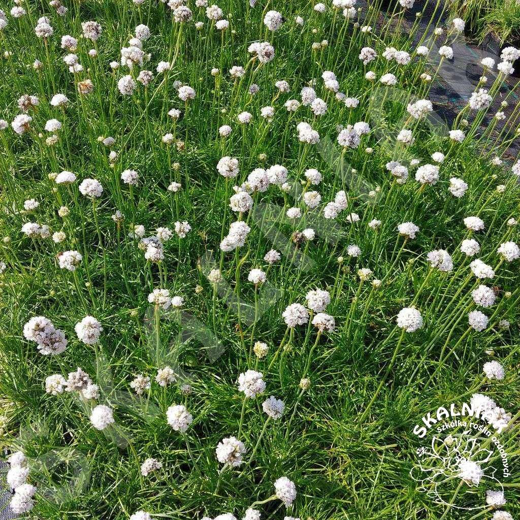 Zawciąg nadmorski 'Abbey White' - jest wieloletnią byliną kępiastą dorastającą do 15 cm w trakcie kwitnienia. Bylina ta wytwarza liczne, białe kwiatki, które są zebrane w główkowate, kuliste kwiatostany o średnicy do 2 cm. Zawciąg nadmorski 'Abbey White' w kwitnie od kwietnia do lipca. Na jesieni może powtórzyć kwitnienie, ale nie jest ono tak obfite jak na początku wiosny. Zawciąg gdy nie kwitnie ma liczne, cienkie, drobne, soczyście zielone liście, które przypominają skoszoną trawę, dlatego polecany jest do sadzenia wzdłuż rabat - tworzy się w ten sposób harmonijne przejście z trawnika do rabaty. Jest idealną rośliną obwódkową. Zawciąg doskonale rośnie na miejscach słonecznych i półcienistych, oraz znosi okresową suszę. Zawciąg jest bardzo odporny na mróz. Armeria maritrima bardzo dobrze wygląda na skalniakach, rabatach kwiatowych, skarpach, murkach. Stosuje się go do uzupełnień między drzewami i krzewami, do obsadzeń linii brzegowej wokół zbiorników wodnych, ponieważ tworzy ładne poduszki zieleni. Doskonale wygląda na rabatach żwirowych i między kamieniami. Polecany do sadzenia z innymi bylinami pełnego słońca, np.: floksami szydlastymi, goździkami, macierzankami, nachyłkami, żagwinami, smagliczką, rdestem czy rumianem.
