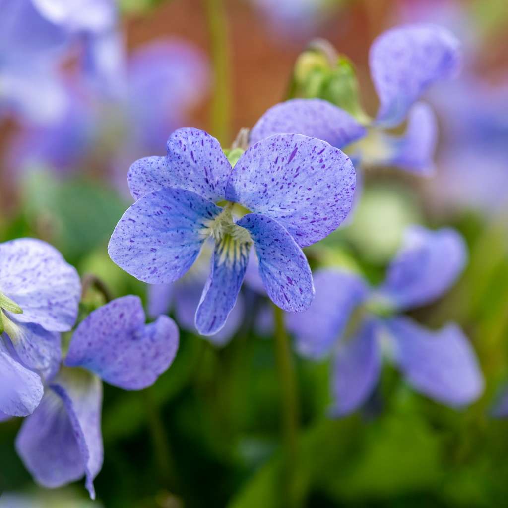 Fiołek motylkowaty 'Dark Freckles' (Viola sororia 'Dark Freckles') to wyjątkowa bylina o niebanalnym wyglądzie. Jego drobne, fioletowo-niebieskie kwiaty pokryte są ciemnymi, nieregularnymi plamkami, które nadają mu niepowtarzalny, malarski charakter. To roślina doskonale sprawdzająca się w naturalistycznych ogrodach, na rabatach i w cienistych zakątkach, gdzie dodaje subtelnej elegancji.