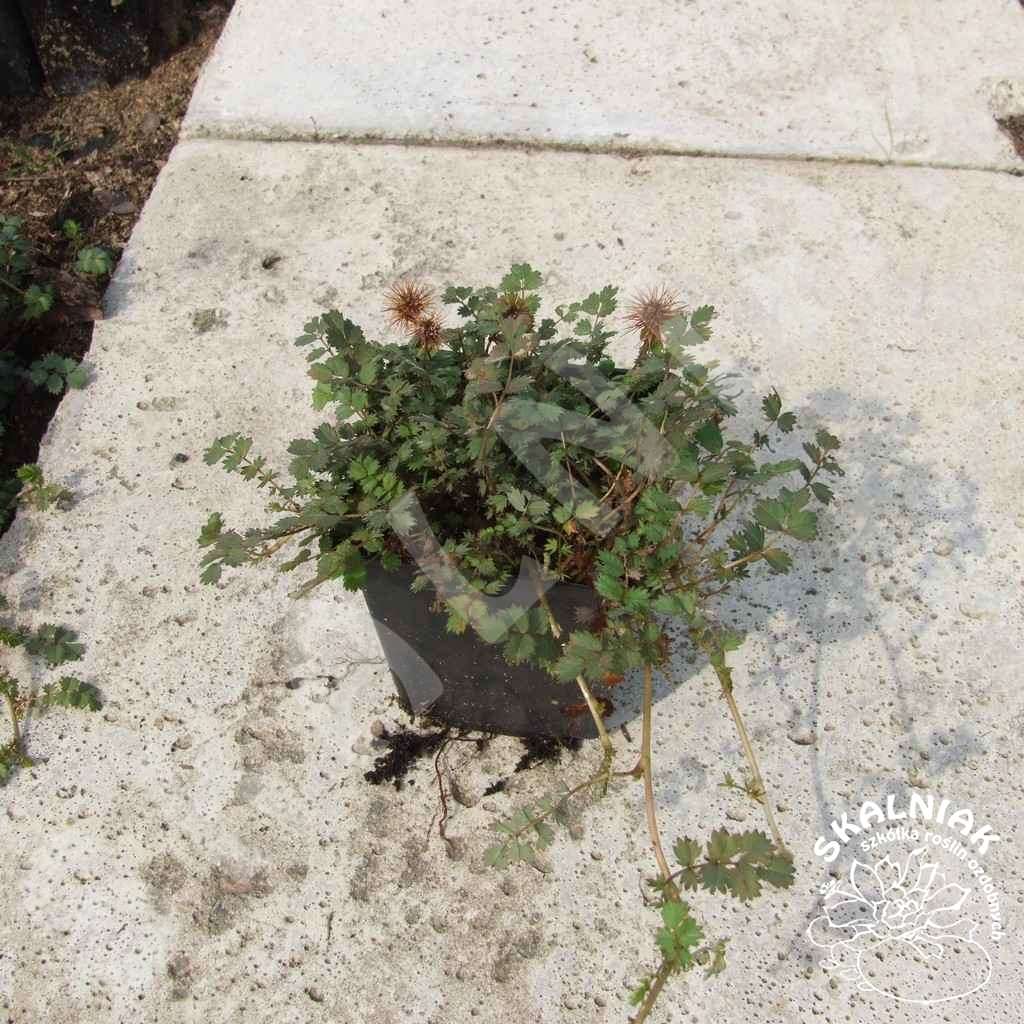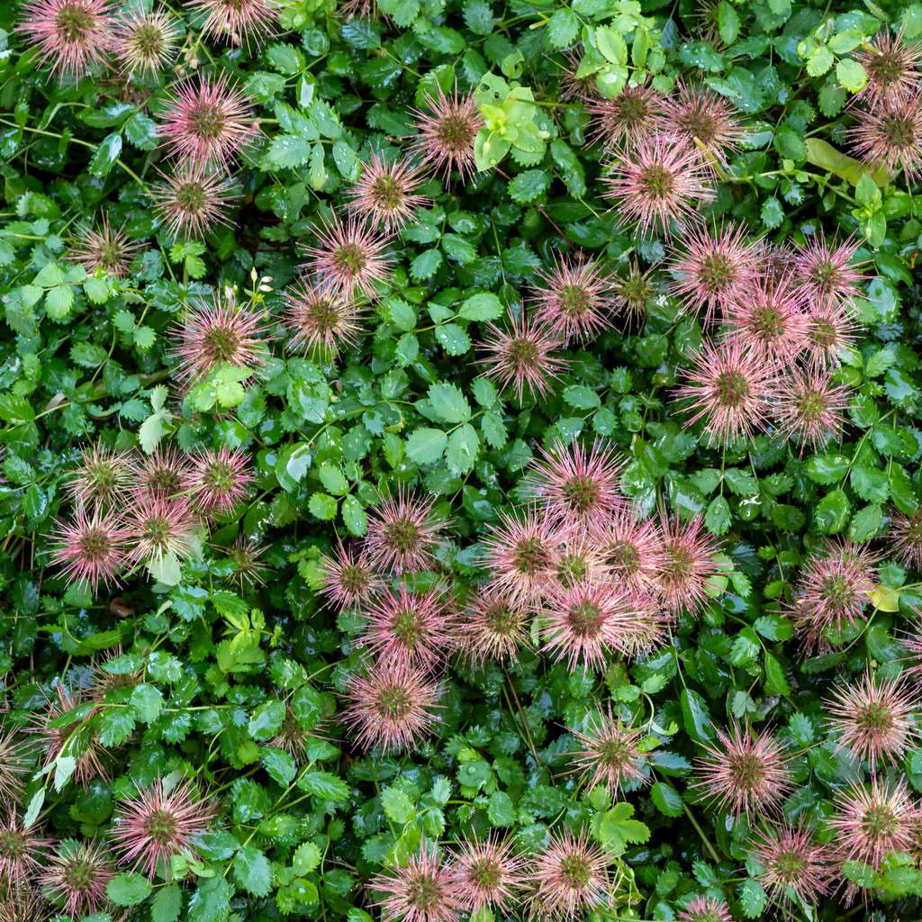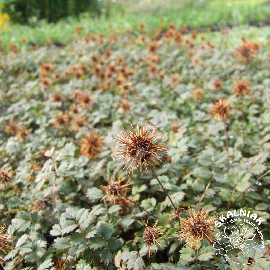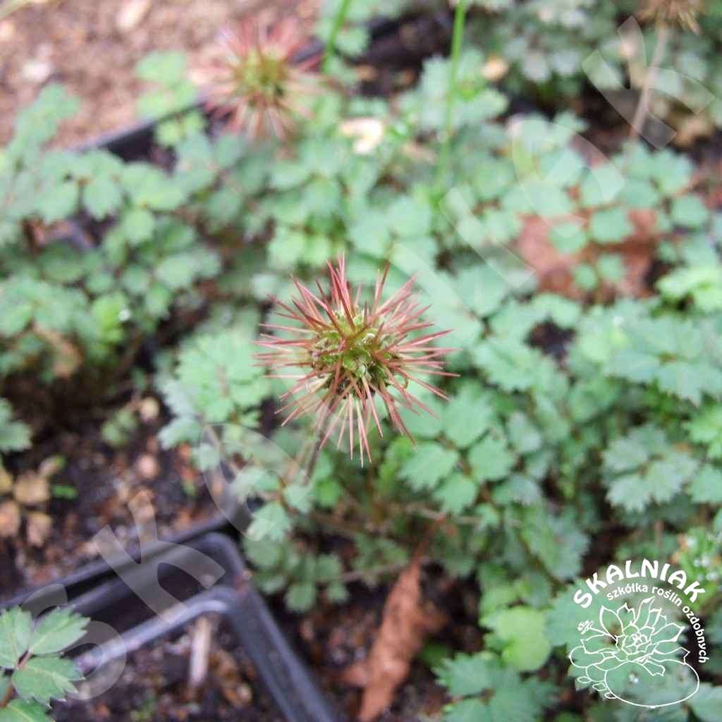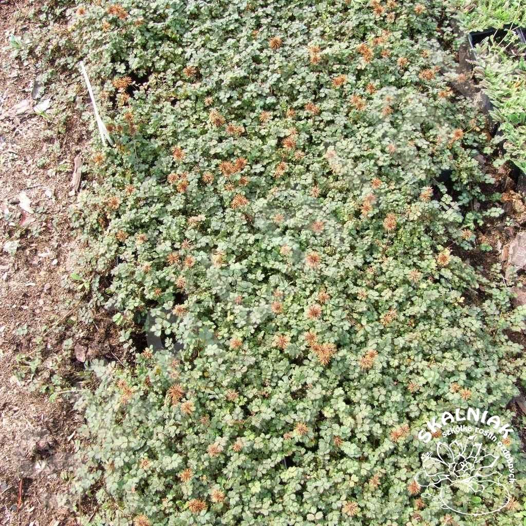 Acaena microphylla rośnie nisko i płoży się długimi pędami, dzięki czemu tworzy zwartą darń. Kępa ma zwykle około 5 cm wysokości, a w czasie kwitnienia unosi się do około 10 cm. Rozrasta się wszerz do około 60 cm. Liście są zimozielone, pierzaste, szarozielone, czasem z czerwonobrązowym nalotem, który jesienią potrafi być bardziej wyraźny. Latem pojawiają się drobne, kwiaty o kulistych, bordowych główkach.